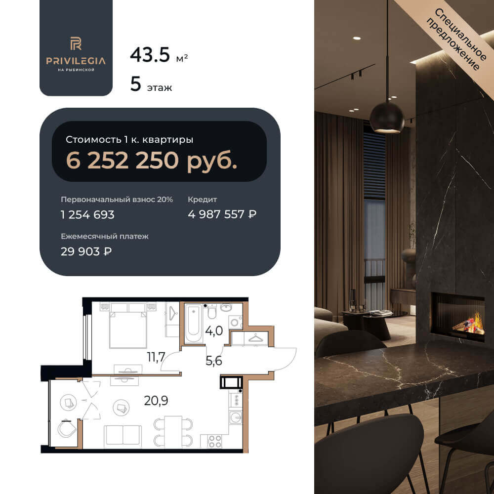 Квартира 115, 5-й этаж, площадь 43,5 м.кв: