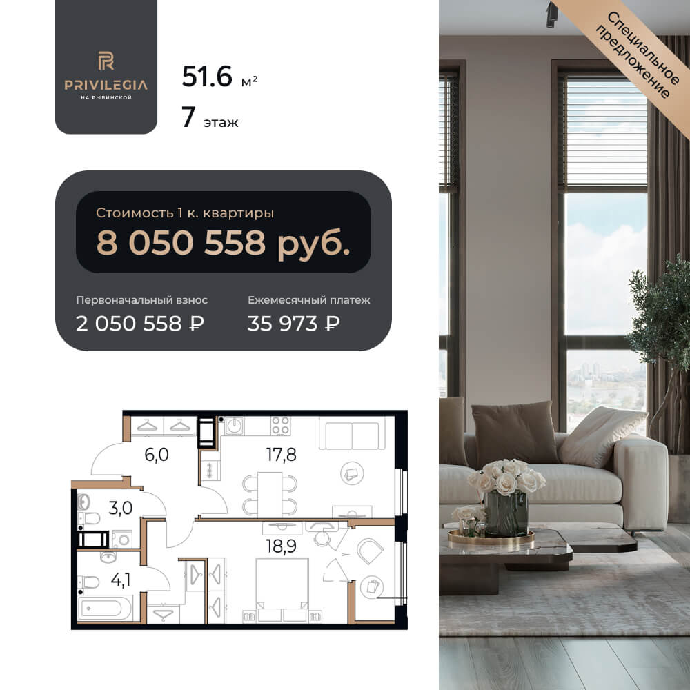 Квартира 125, 7-й этаж, площадь 51.6 м.кв: