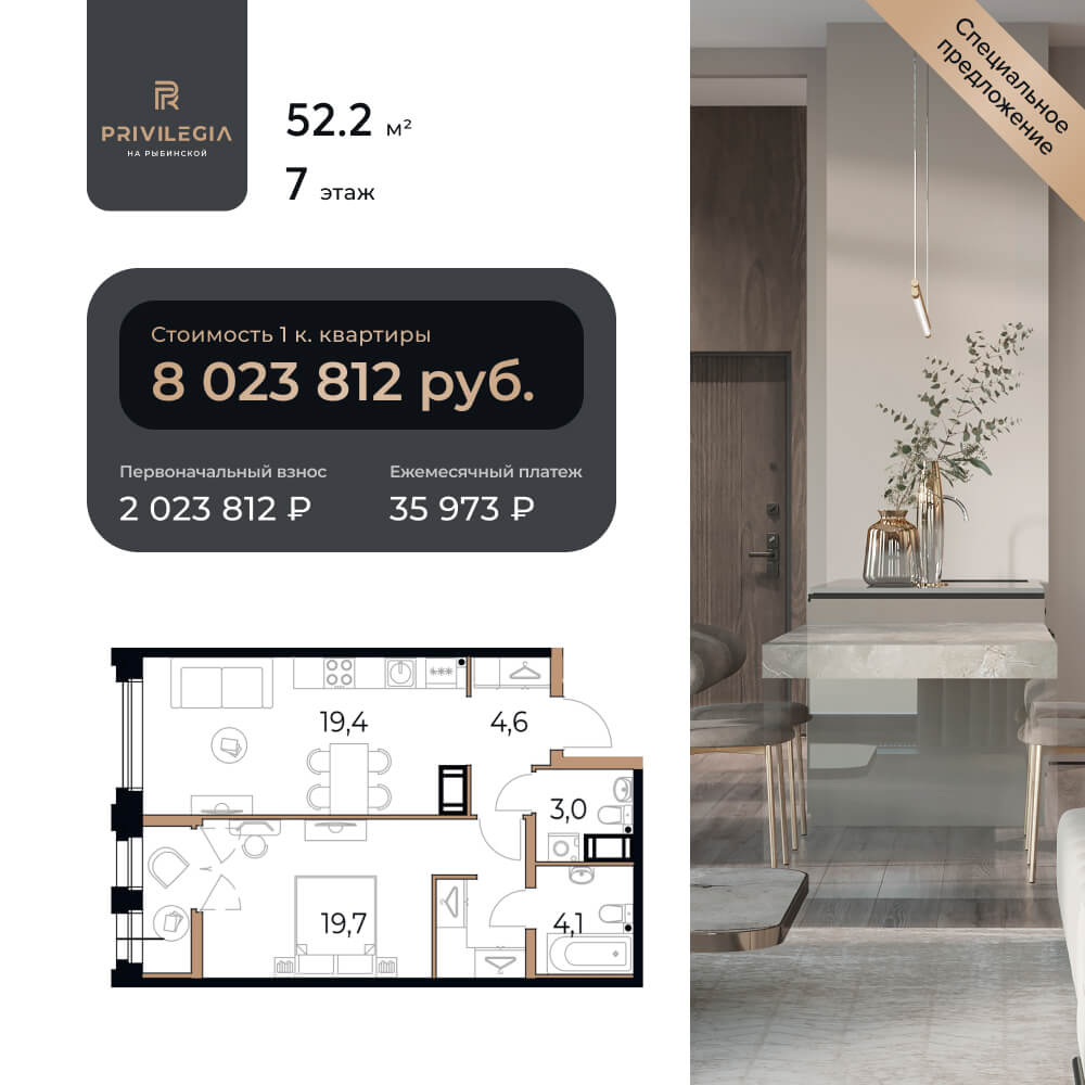 Квартира 126, 7-й этаж, площадь 52.2 м.кв: