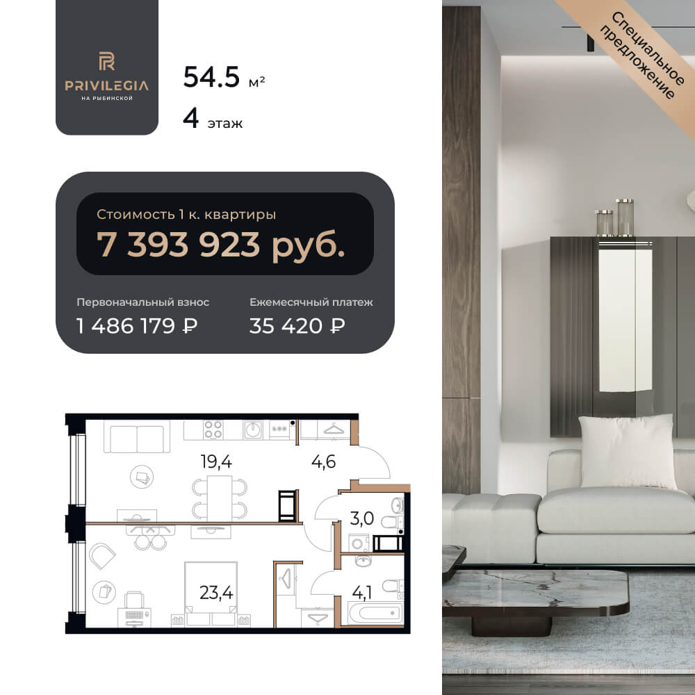 Квартира 108, 4-й этаж, площадь 54.5 м.кв: