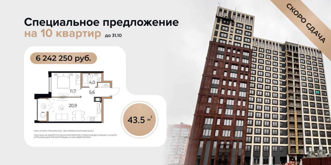 В рамках специального предложения стоимость однокомнатной квартиры площадью 43,5 кв.м составит 6 242 250 рублей при единовременной оплате. Сдача комплекса — уже скоро!